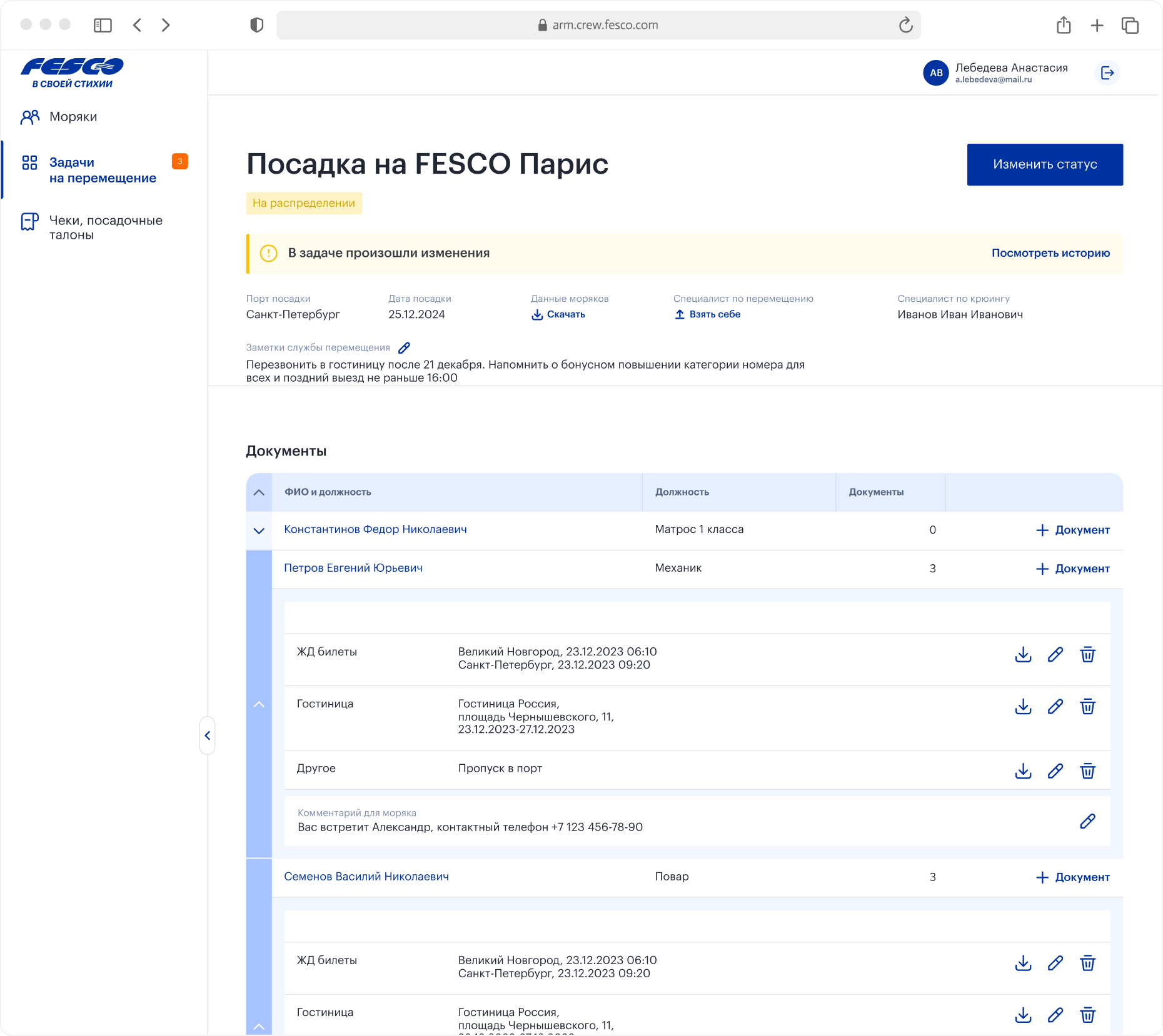 В процессе работы менеджер оставляет комментарии морякам, заметки себе, обновляет статусы. При изменении задачи извне, например, рейс переносится, специалист получает уведомление со ссылкой на историю изменений. Он сразу видит, какие правки были внесены.