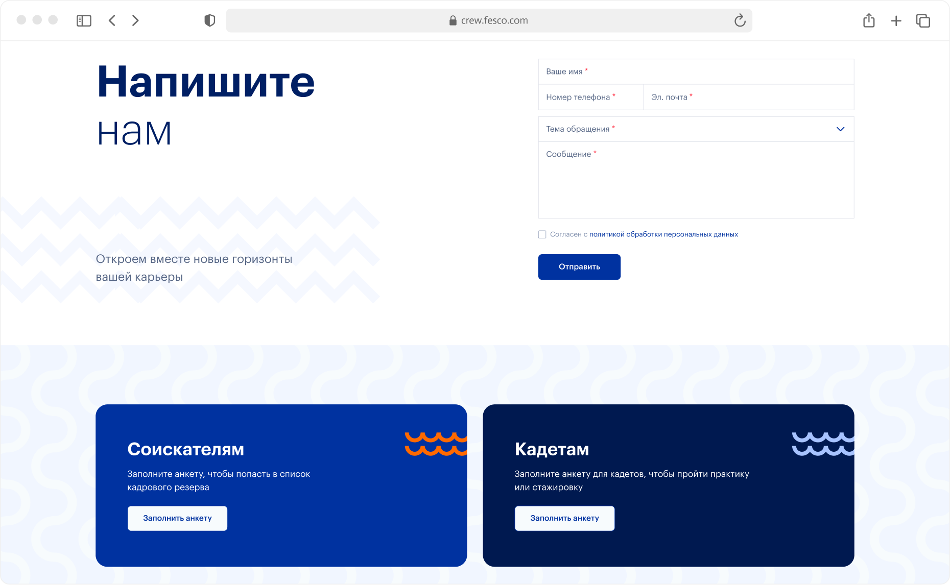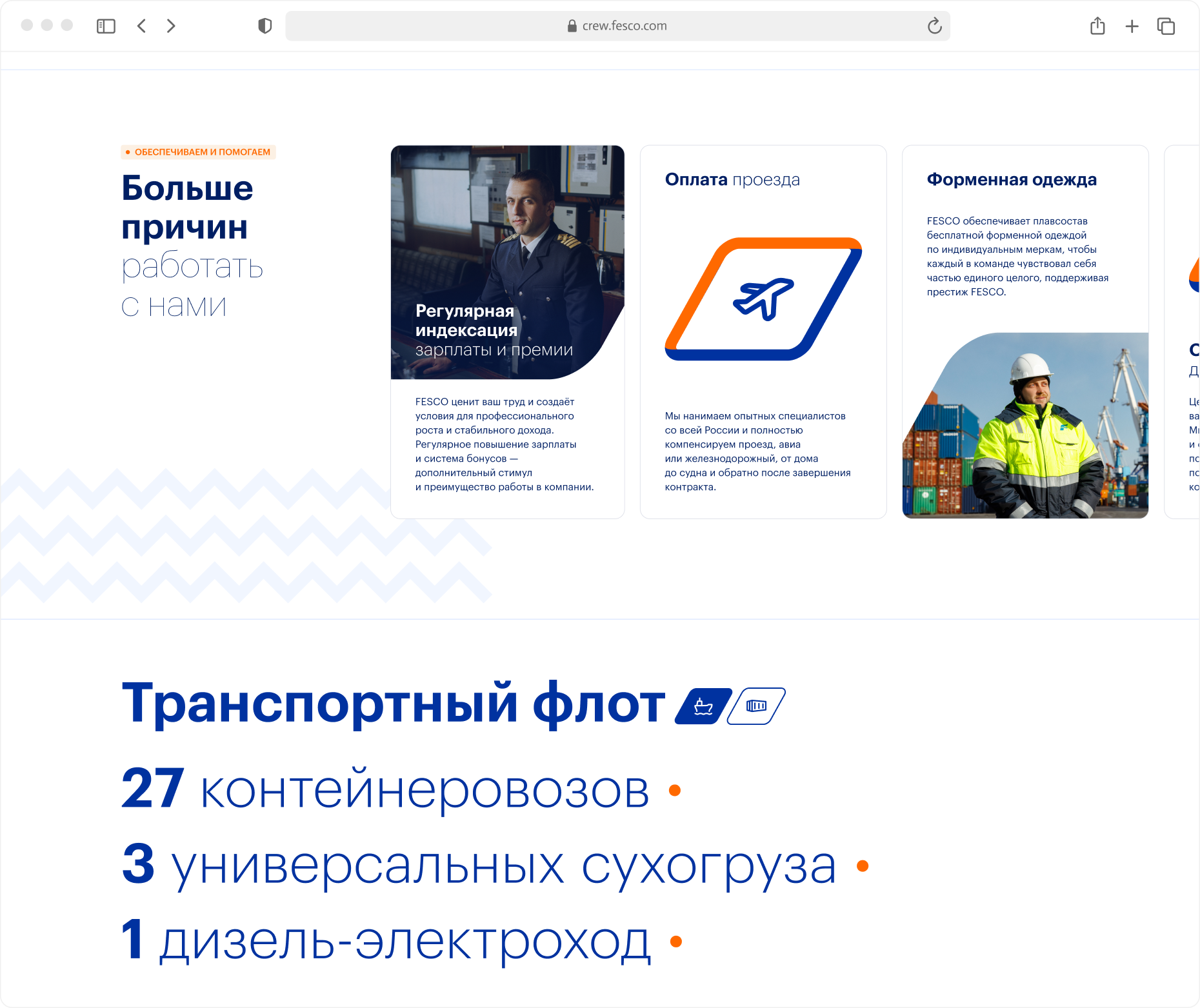 Путь моряка начинается на сайте crew.fesco.com. Это точка входа для кадрового резерва. Мы сделали его простым и четким — собрали всё, что важно соискателю. На сайте понятно, чем живёт FESCO, какие события происходят в компании, какие вакансии открыты и почему здесь хотят работать. Контентом управляет команда FESCO — без разработчиков.
