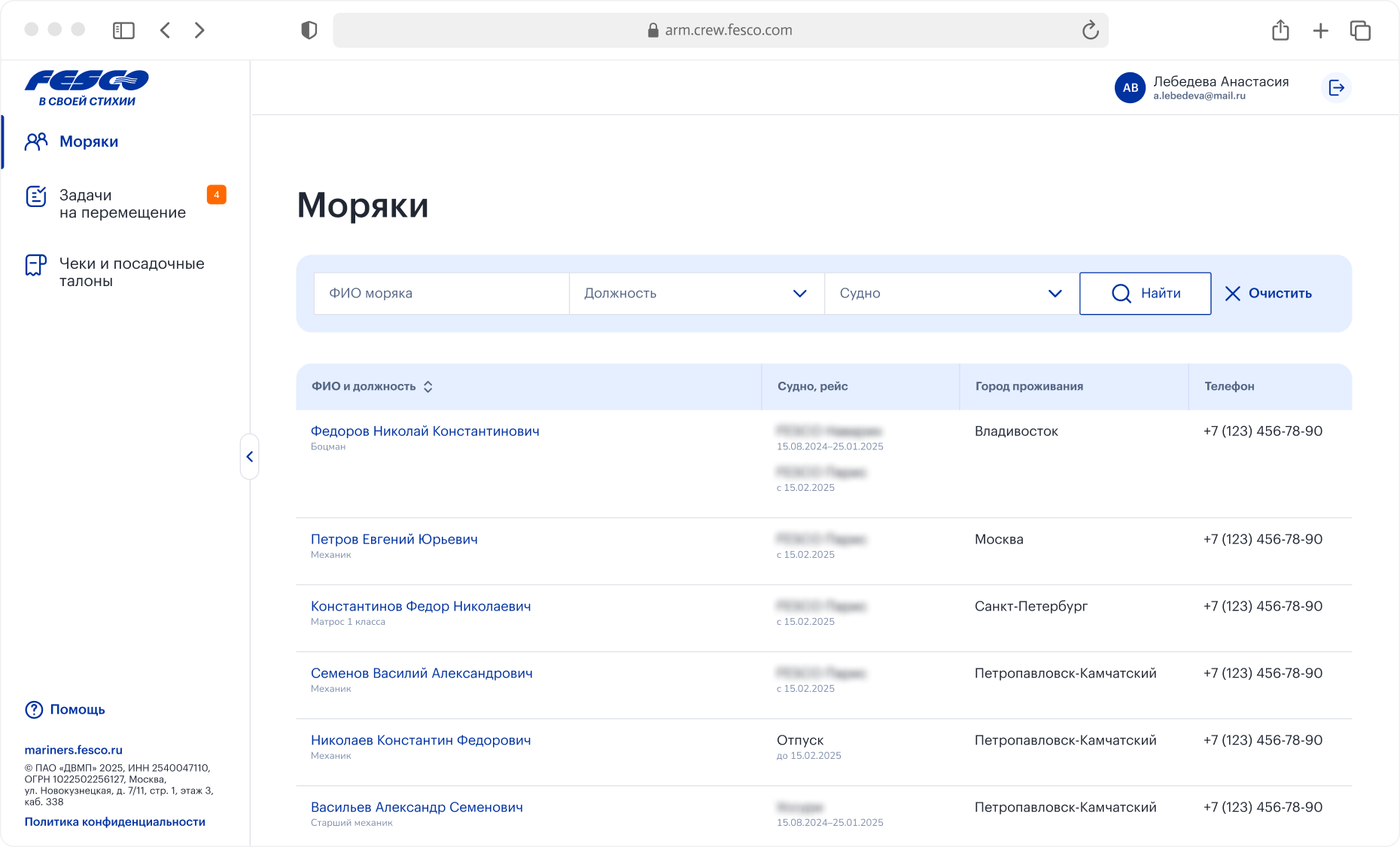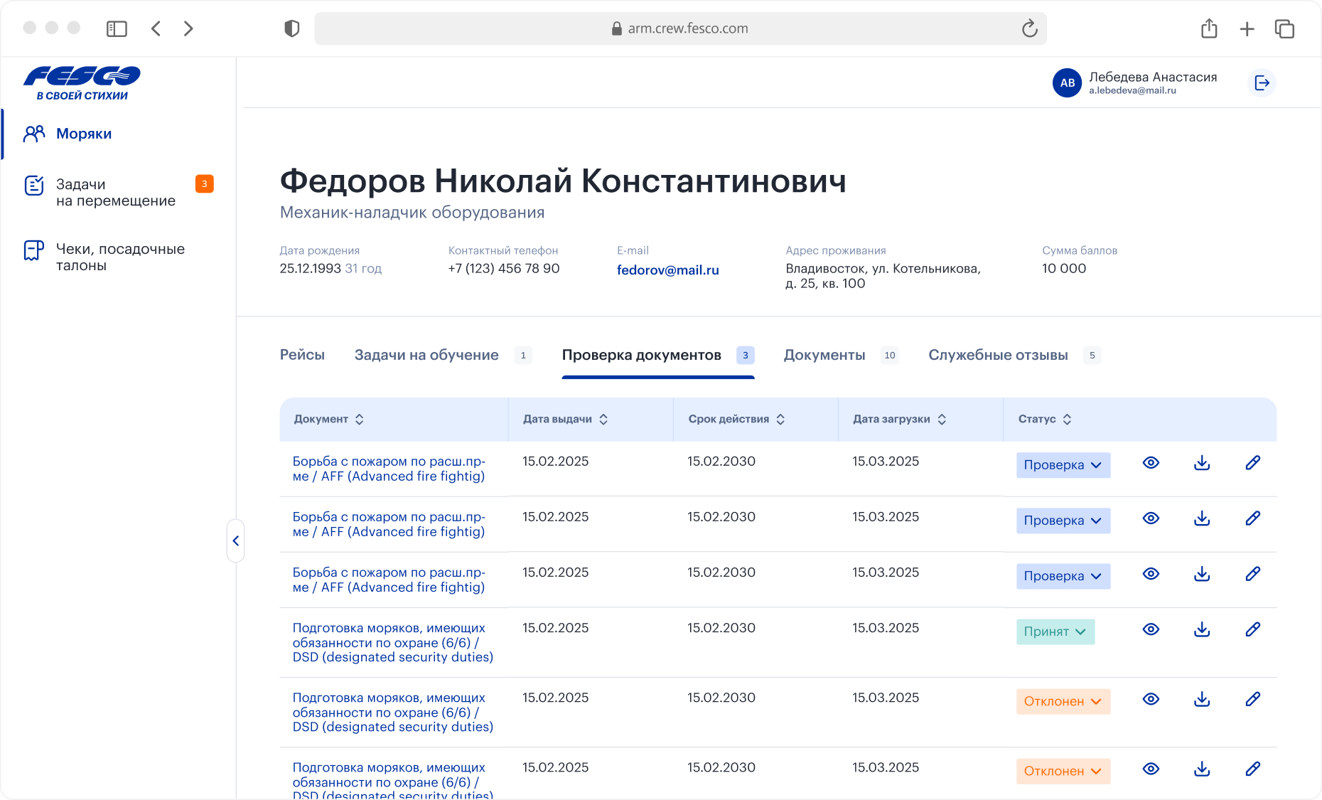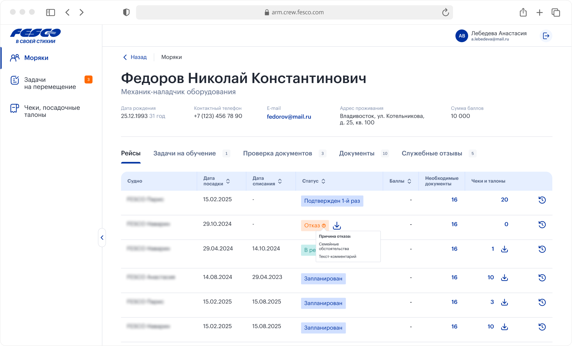 В АРМ специалист видит каждого моряка: контакты, историю рейсов, статусы, документы с датами истечения, служебные отзывы из 1С. Информация собрана в гибкую таблицу с сортировкой и фильтрацией. На детальной странице моряка добавлено разделение по типам информации, чтобы не перегружать интерфейс: рейсы, задачи на обучение, проверка документов, документы, служебные отзывы. Если FESCO предлагает моряку новый рейс, менеджер получает уведомление о его решении.