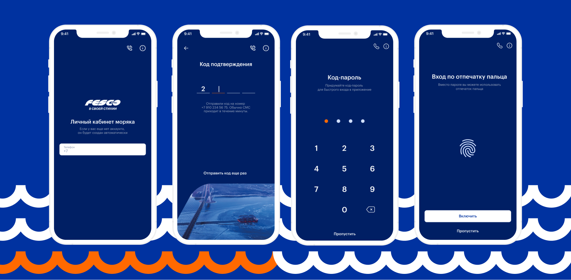 Моряк, который уже работает с FESCO, заходит в приложение по номеру телефона и коду. Приложение предлагает придумать пин или подключить вход по отпечатку пальца.