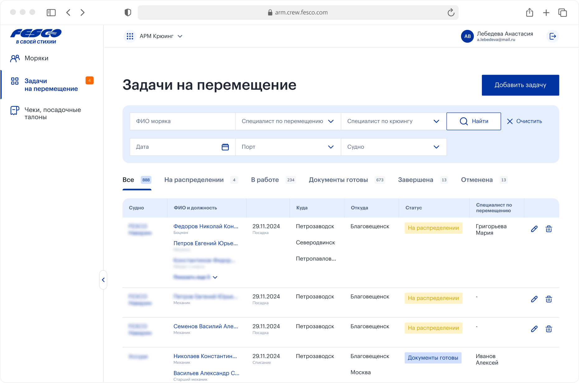 Менеджер формирует задачи специалистам по перемещению экипажей для организации доставки моряков в порт посадки, возвращения в город проживания. В задачу можно добавить как одного моряка, так и весь экипаж судна. По завершении рейса именно