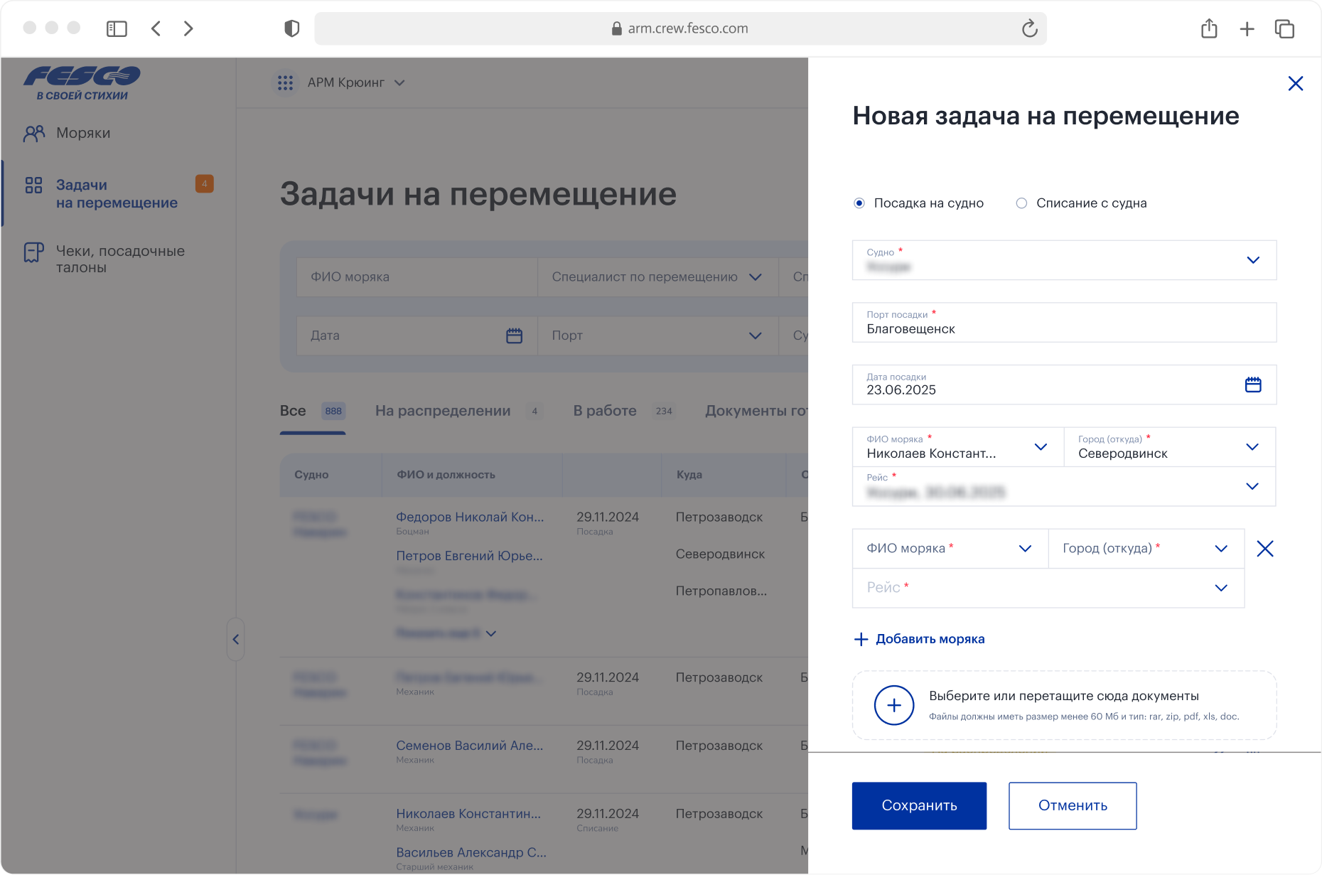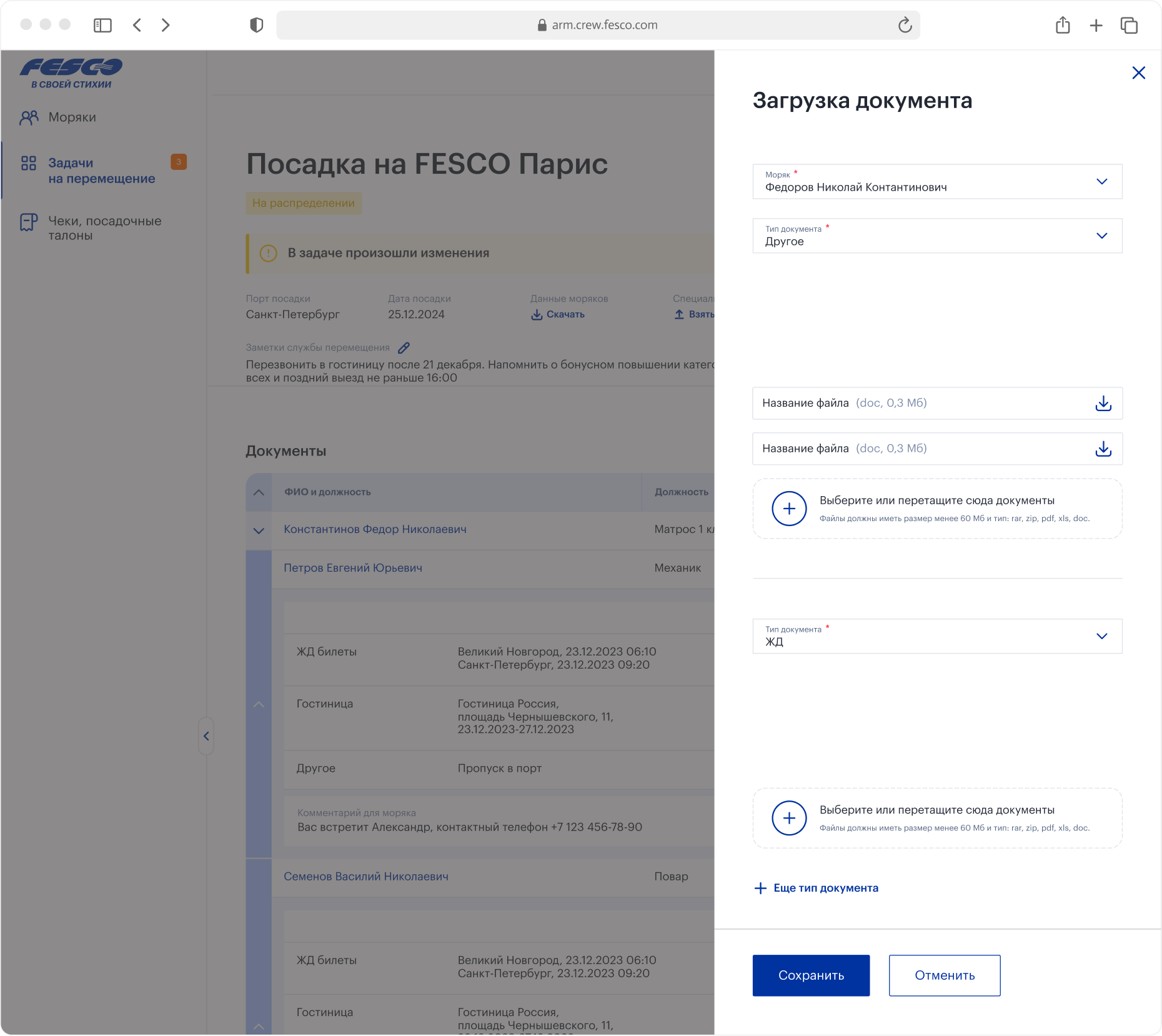 Основной рабочий инструмент специалиста по перемещению — загрузка разных типов файлов. Билеты, пропуски, ваучеры. Для этого создан удобный интерфейс, где задача на рейс разбита по морякам, а документы можно прикрепить разом, указывая тип.